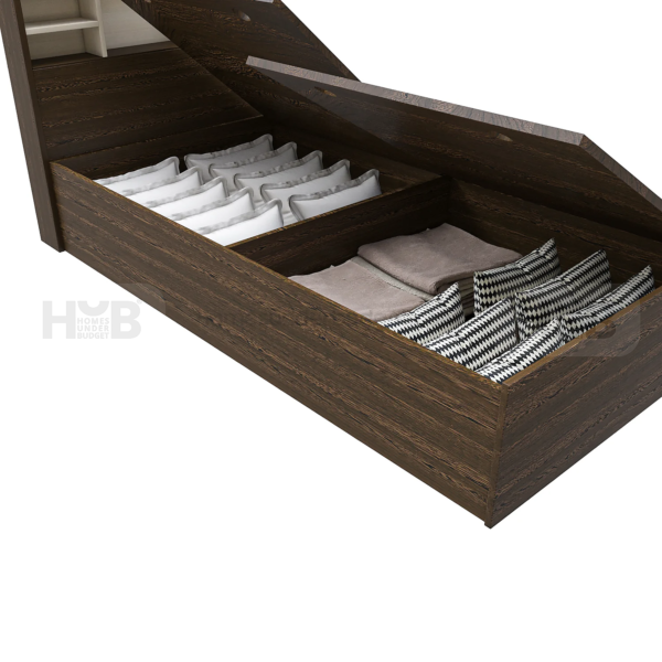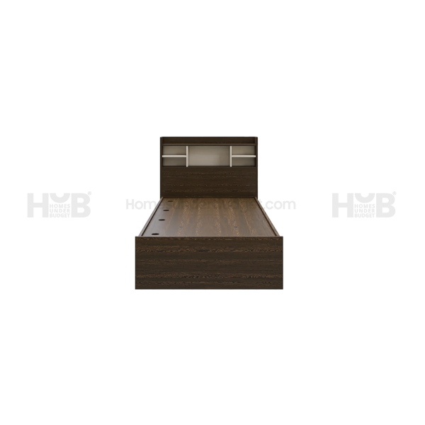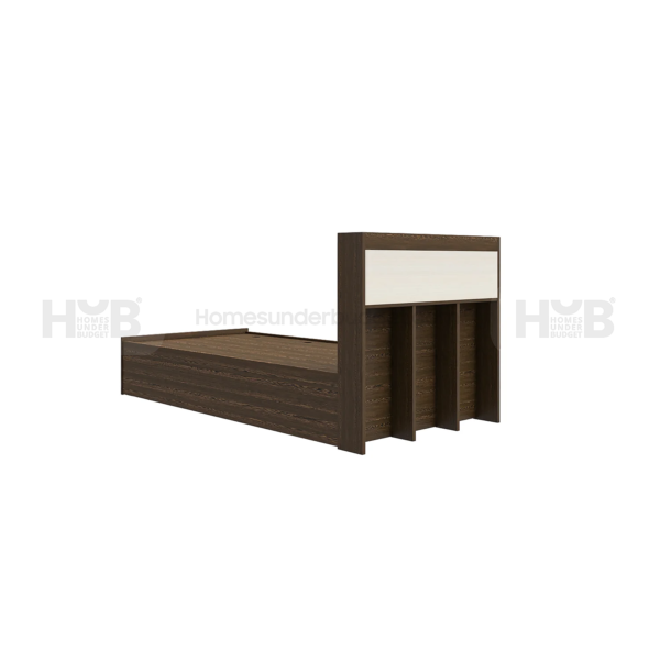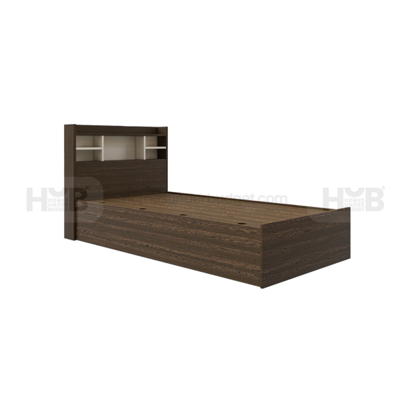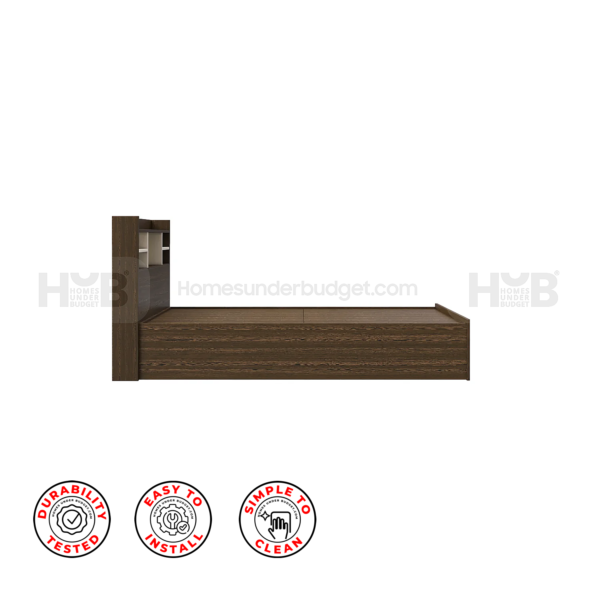 - The headboard of the bed is detailed with open storage head board which is a modern and attractive designer appearance. This bed also assists sufficient storage beneath.